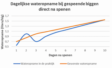 Op de tweede dag ligt de wateropname ver boven de gewenste wateropname als gevolg van het te weinig drinken op de eerste dag na het spenen. Na de derde dag zal de wateropname iedere dag stijgen.